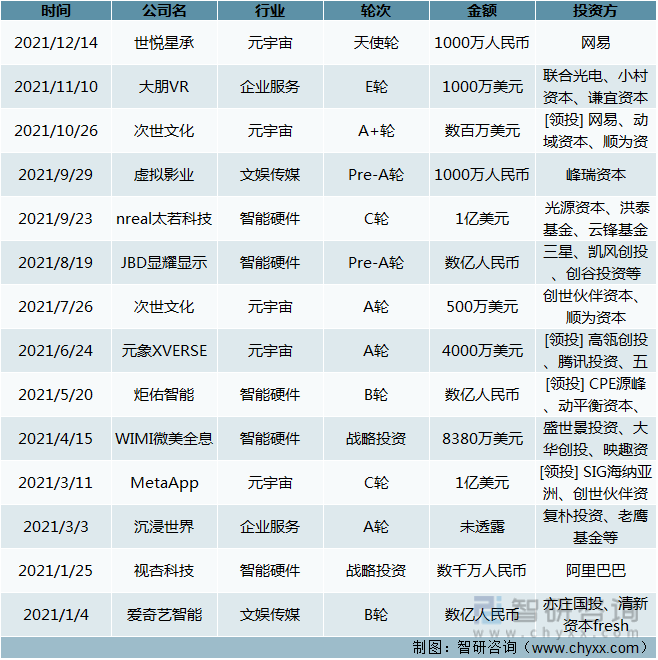 智研咨询的统计数据显示,2021年,中国VR/AR行业投资数量共计99起,累计投资金额达到109.2亿元,网易、腾讯、阿里等大厂均出现在投资方列表中。