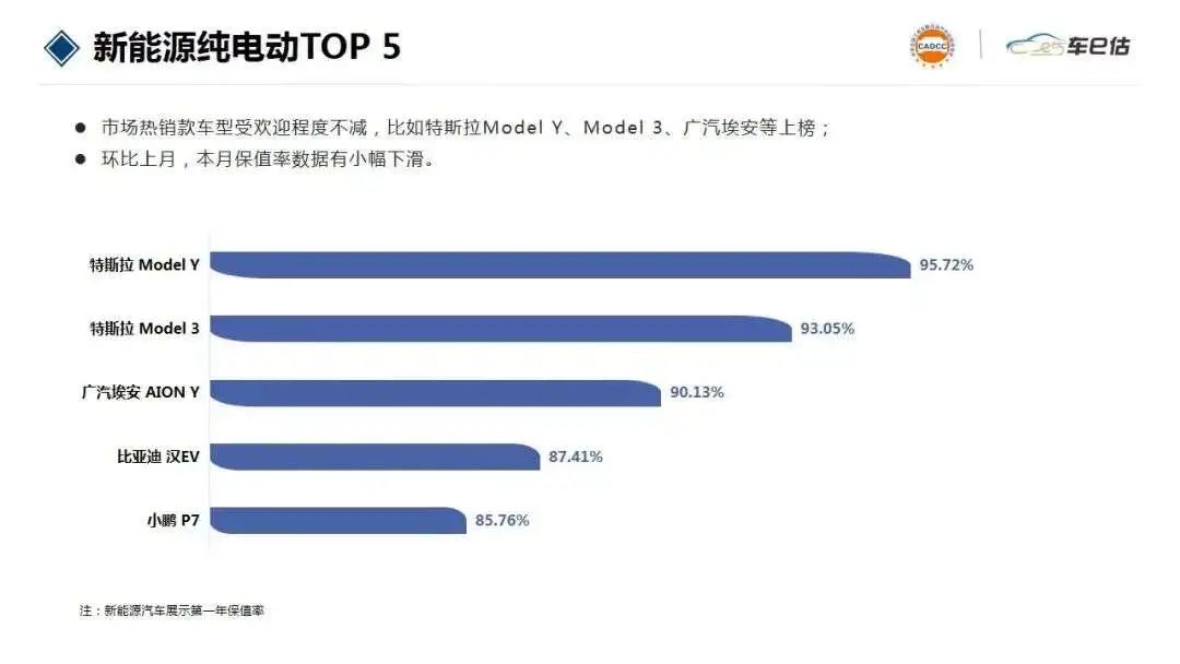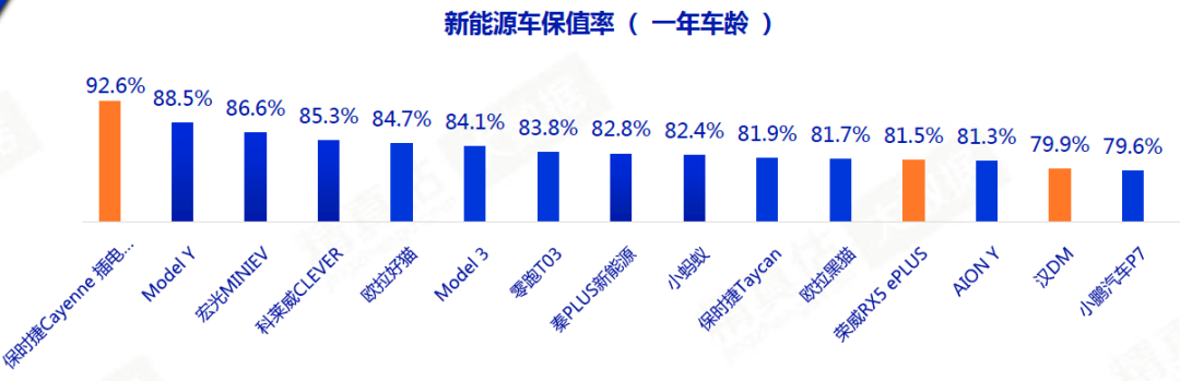 特斯拉Model Y、宏光MINI等热门车型的保值率就很高,超过大部分燃油车品牌。