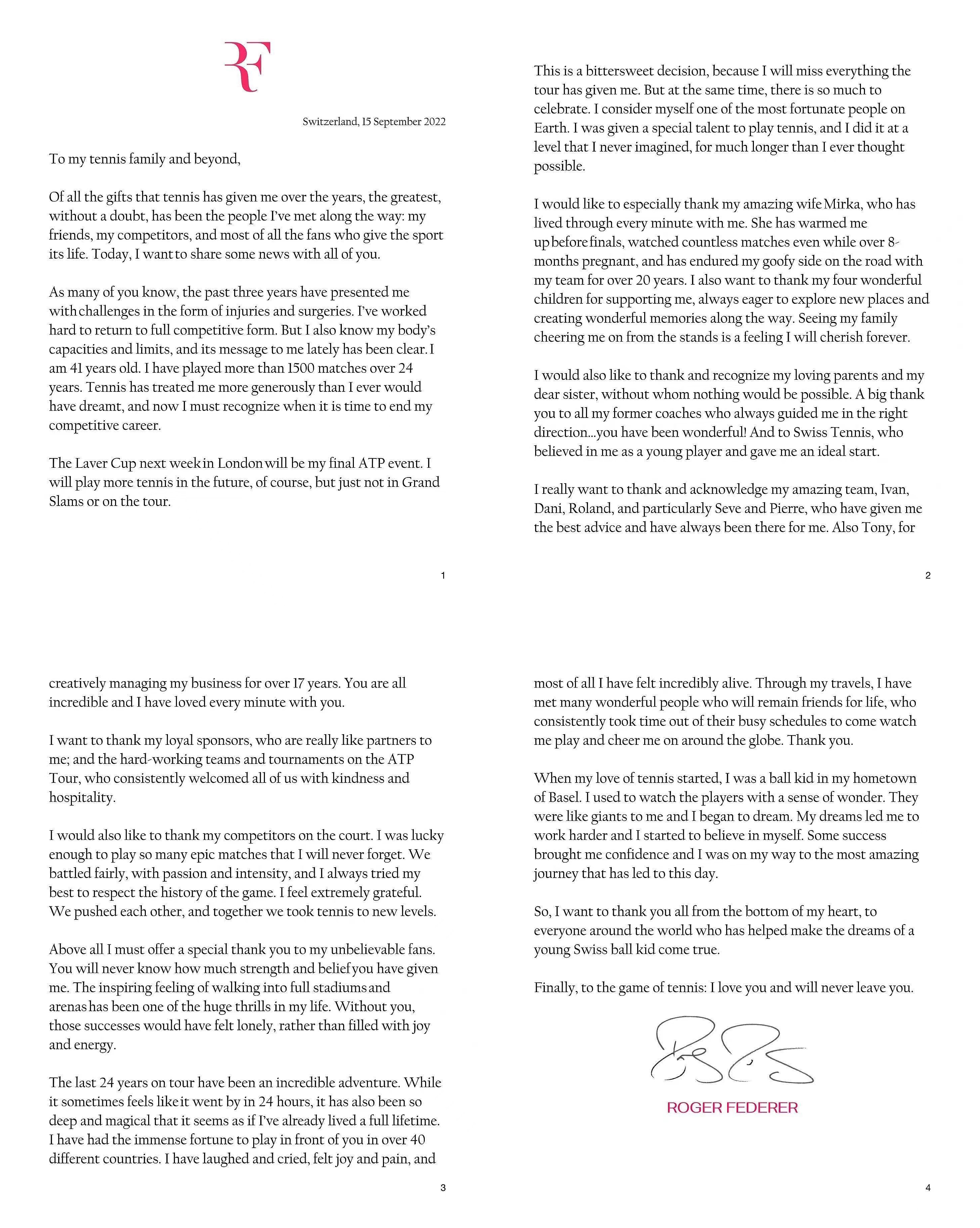 “在这些年网球给我的所有礼物中,最棒的毫无疑问是我一路上所遇到的人:我的朋友、我的竞争对手、以及最重要球迷,是他们给予了这项运动生命。