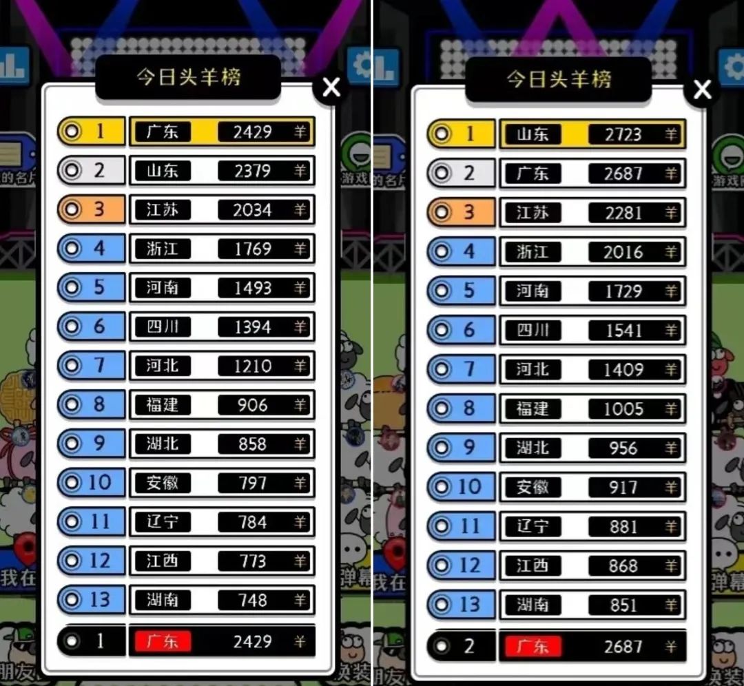不过好景不长,当天下午,山东羊队又被浙江羊队反超。几个小时后,浙江羊队又被湖南反超,到今天晚上,山东队又再次登顶.......