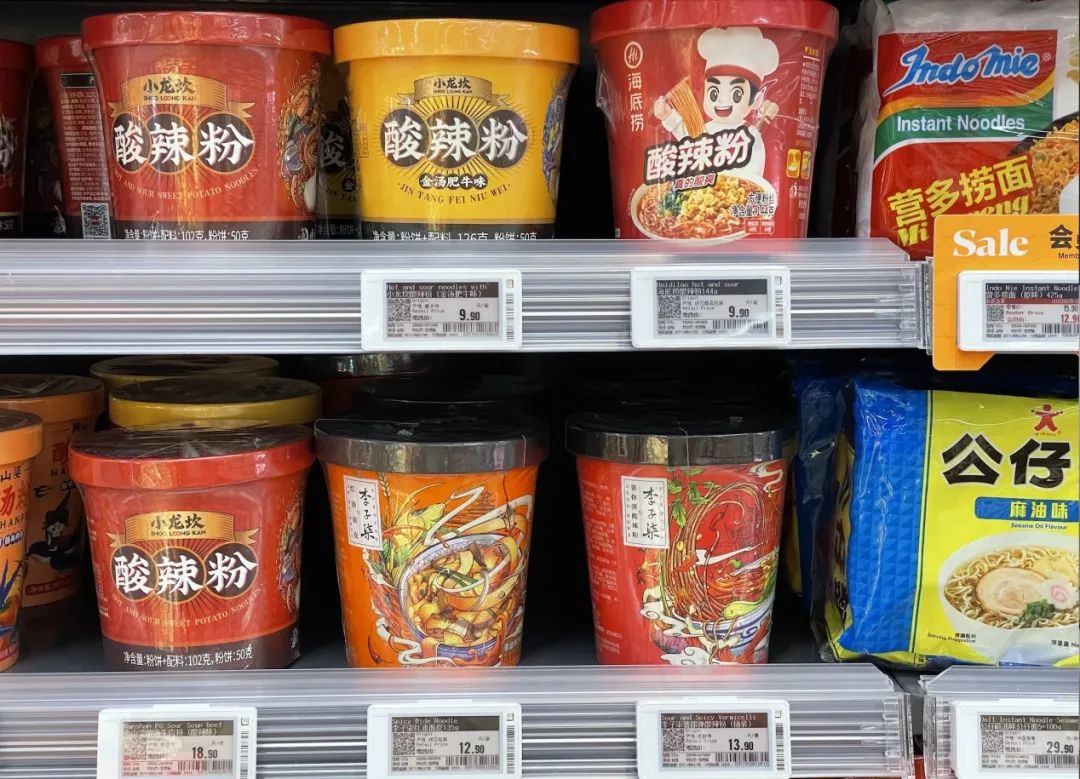 在万象城OLE超市方便食品区,网红零食占据货架显眼位置,其中售价12.9元的李子柒酸辣粉和9.9元的小龙坎酸辣粉均由阿宽食品代工,但货架上不卖阿宽品牌方便食品。