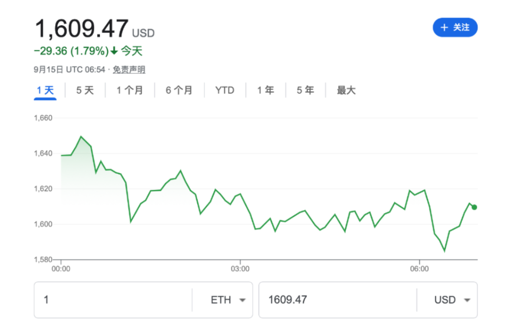 值得一提的是,虽然以太坊在24 小时内下跌了6.81%,但ETH相对于比特币仍上涨了2.96%。当前以太坊币价在 1600 美元左右。