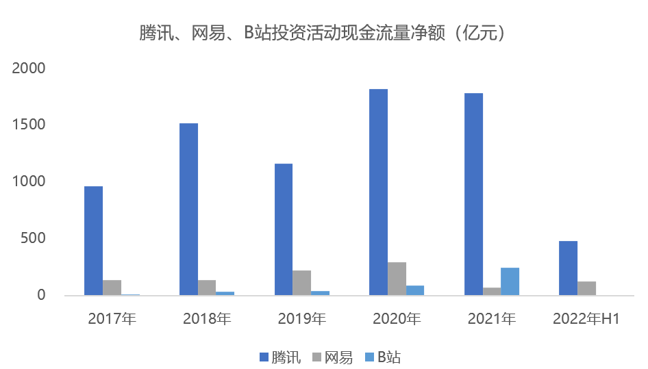 注:投资活动现金流量净额在财报中为负数,为方便对比图中统计为正数;B站暂未披露22H1投资活动现金流量净额