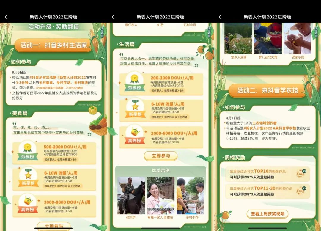 在大环境日趋严峻的当下,现在要做三农短视频,对于内容、形式等方面都有不小的挑战。但这并不代表,就没有机会了。除了做直播带货之外,抖音9月9日推出的“新农人计划2022进阶版”全方位扶持三农内容创作。抖音将拿出亿级流量、百万dou+等流量资源,给予三农创作者流量包和dou+奖励。