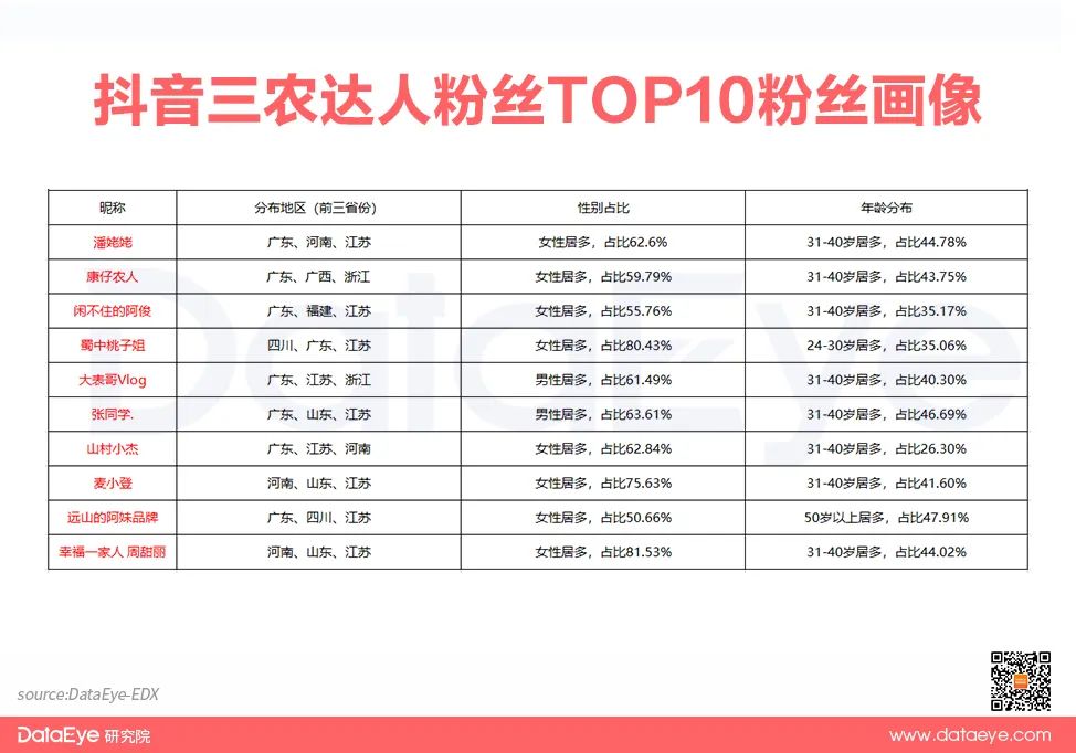 抖音新农人的TOP10榜单,其粉丝基本集中在广东、山东、江苏、河南这几大省。女性粉丝居多,31-40岁的群体已是支撑“三农”短视频内容的中流砥柱。