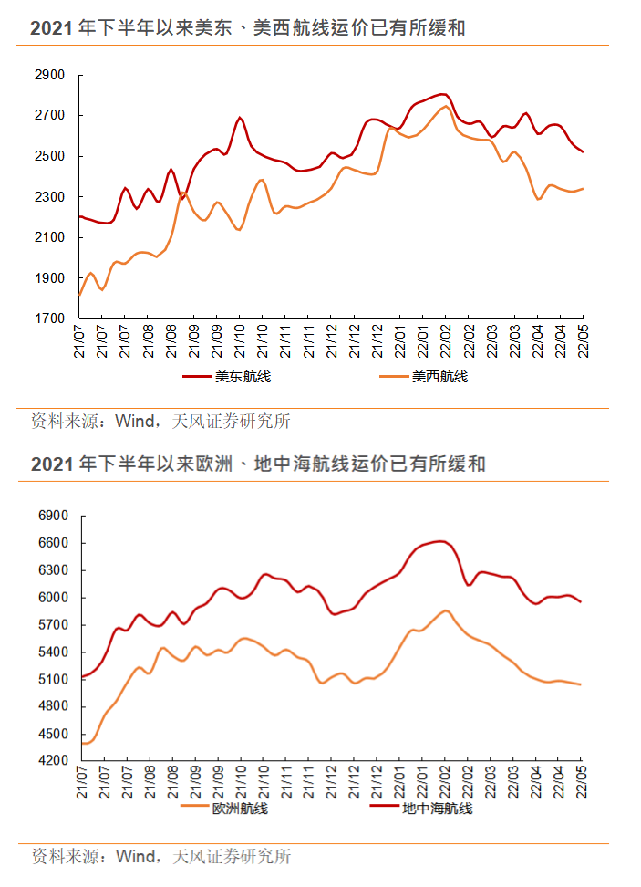 依据波罗的海集装箱运价指数来看,2021年运价于9月份达到高位,今年以来随着集装箱供应紧张的问题逐步缓解,以及美国港口周转效率提升,运价进入22Q2之后加速下滑,运价回落至2021年5月底的位置,未来航运价格仍有继续下降的预期。