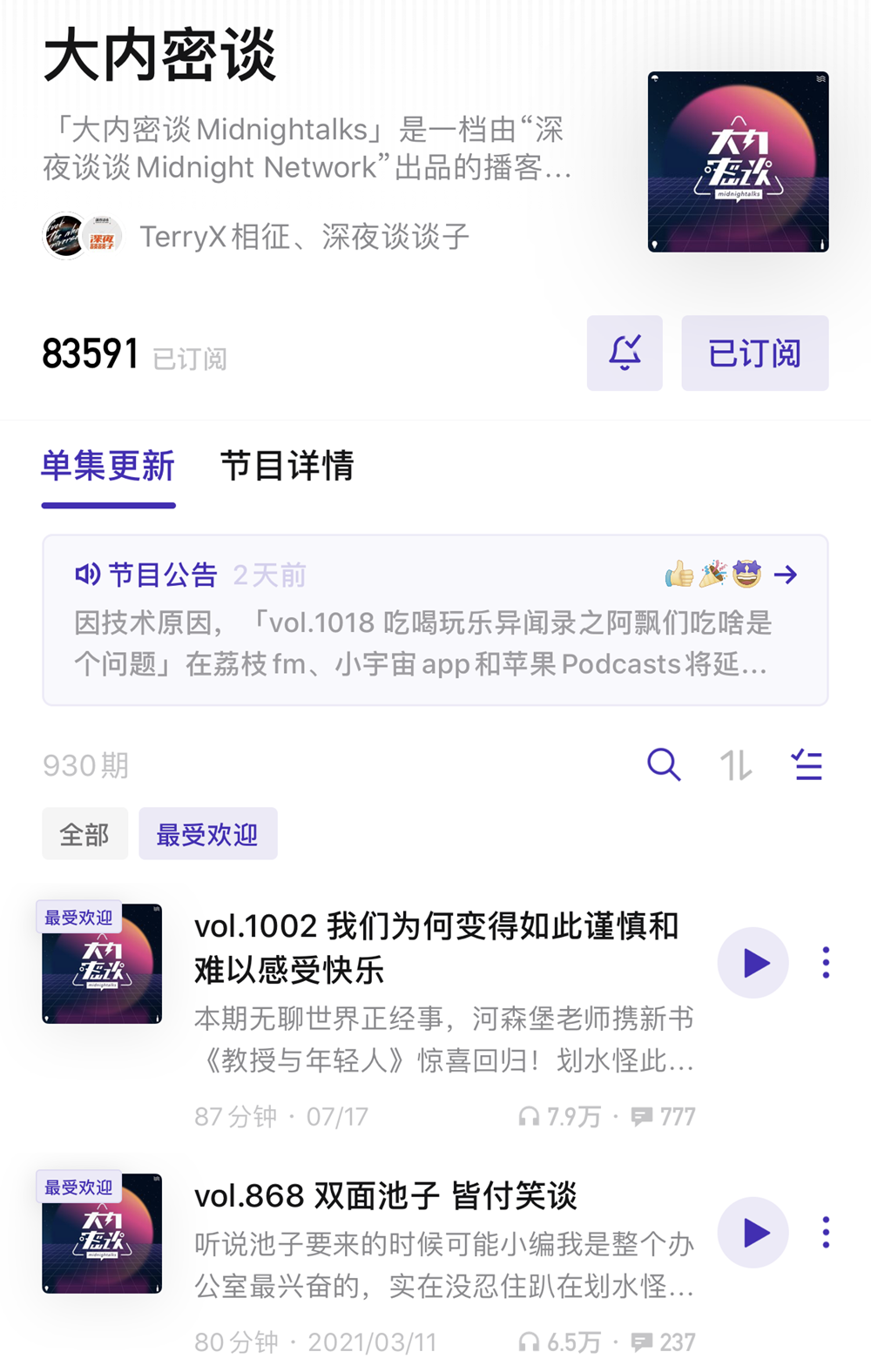 《大内密谈》在2013年末荣获当年苹果年度最佳新播客奖,2017年正式成为一个商业项目,2018年拿到了ONES Ventures数百万元天使投资,直到今年的7月10日第1000期上线,收听量已经到了400万。