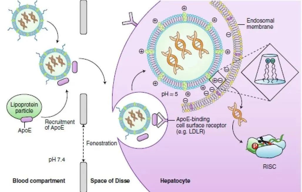 2018年,全球首款上市的小干扰核糖核酸(siRNA)药物通过新型脂质纳米颗粒(Lipid Nanoparticle, LNP)技术包裹递送到肝脏,用于治疗遗传性甲状腺素介导的淀粉样变性的多发性神经病。