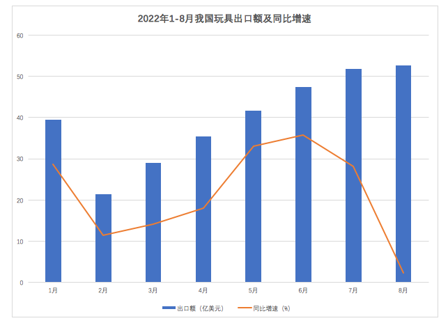 中国作为全球最大的玩具出口国,在今年前8月玩具累计出口额为 316.8 亿美元,同比增长 20.2%,但8月份的出口额同比增速大幅下降,仅为2.3%,创一年新低。
