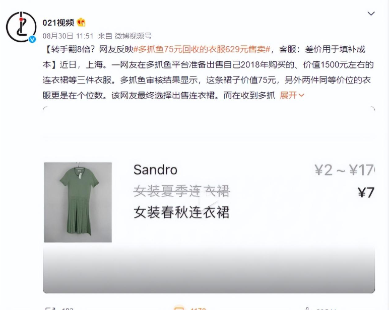 如果二手货不便宜了,你还会考虑二手货吗?最近,二手交易平台多抓鱼被用户投诉以75元的价格回收一件价值上千的连衣裙,后又以629元在其平台上出售,上演了一出“中间商大赚差价”的戏码。