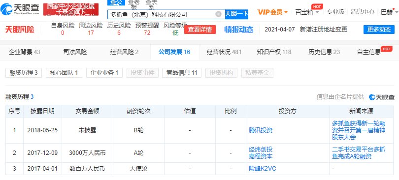 据天眼查数据显示,多抓鱼历经三次融资,但是2018年B轮后再无动静。