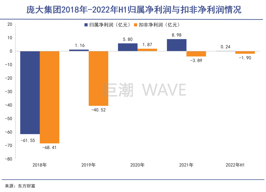根据庞大集团2020和2021年报显示,两年的净利润分别为5.80亿元和8.98亿元。2022年上半年,庞大集团净利润仅为2404.62万元。