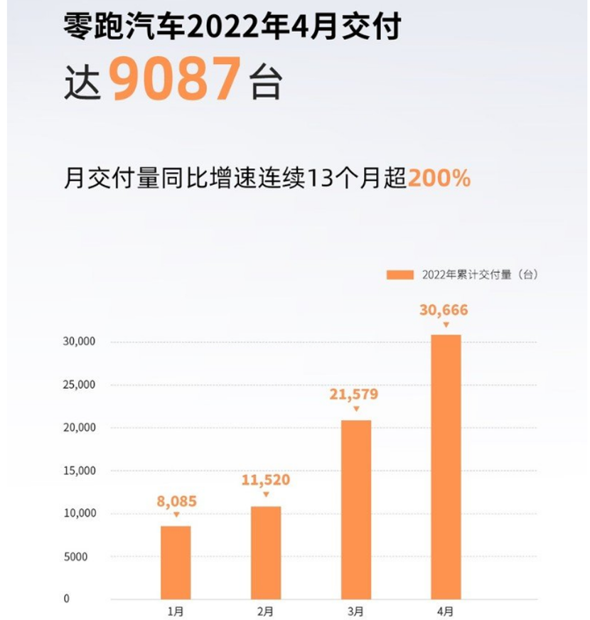 凭借T03和C11两款主力车型的热销,今年4月,零跑汽车交付量达到9087台,实现连续13个月同比增长超200%,并首次夺得新势力品牌销量冠军之位。