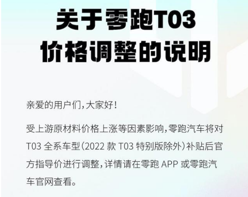 7月31日,由于锂电池等原材料价格的持续上涨,零跑已经对T03车型全系进行了价格上调,补贴后售价从之前的7.39万元到8.99万元,涨价为7.95万元到9.65万元。调整后的价格已经于2022年8月1日零时正式生效。