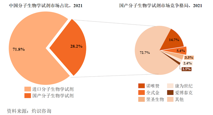 根据中国科学院第三方科研服务平台“喀斯玛”的统计,截至2020年底,承担重要课题项目的中科院院属96家机构的进口生物试剂交易额占比高达83%,即便在2020年新冠疫情情况下,国内仍有72%的生物试剂交易依赖进口。根据灼识咨询数据,2021年全式金的分子生物学试剂在国产品牌中占有5.4%的市场份额,市占率较低。