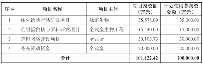 此轮上市,全式金计划募集资金10亿元,用于体外诊断产品研发、重组蛋白核心原料研发、营销网络建设以及补充流动资金等。