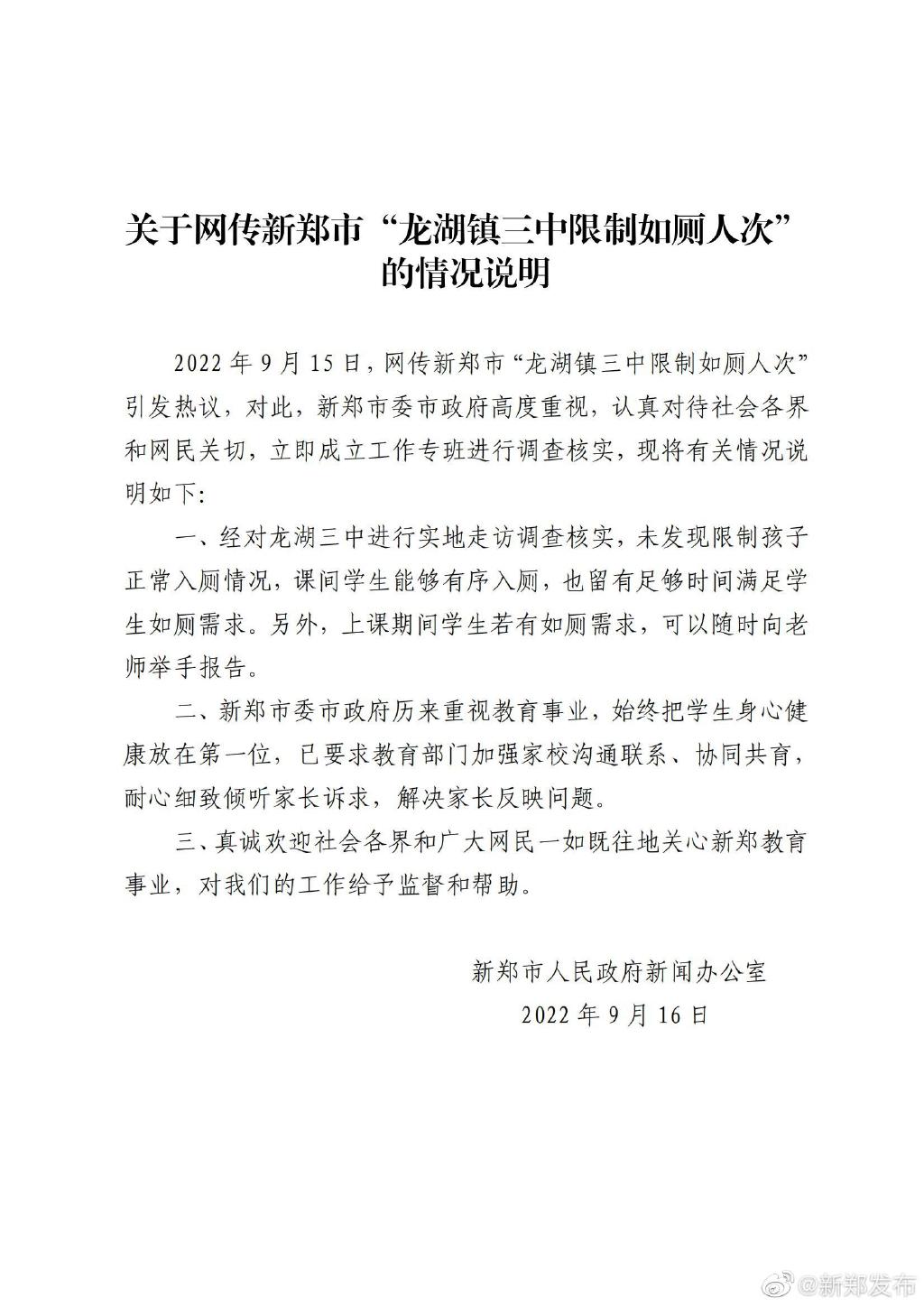 中共新郑市委宣传部官方微博9月16日消息,新郑市人民政府新闻办公室发布《关于网传新郑市“龙湖镇三中限制如厕人次”的情况说明 》,具体内容如下。