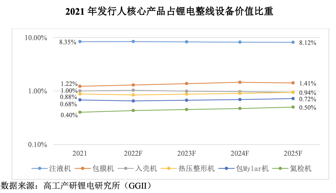 在招股书“公司核心产品的市场空间”表述上,誉辰智能表示,“根据GGII对中国锂电池电芯制造设备市场结构与预测及2021年发行人核心产品占锂电整线设备价值比重数据统计显示,2022年-2025年国内电池厂商的锂电设备投资规模大概为3600亿元,发行人核心产品包膜设备、注液设备、氦检设备、热压整形设备、包Mylar设备和入壳设备在锂电池整线设备投入的占比约为12.53%,大致匡算发行人核心设备在未来五年市场的需求量约为450亿元,其中发行人销售收入占比较高的产品包膜设备和注液设备在锂电池整线设备投入的占比约为9.57%,未来五年市场的需求量约为350亿元。”