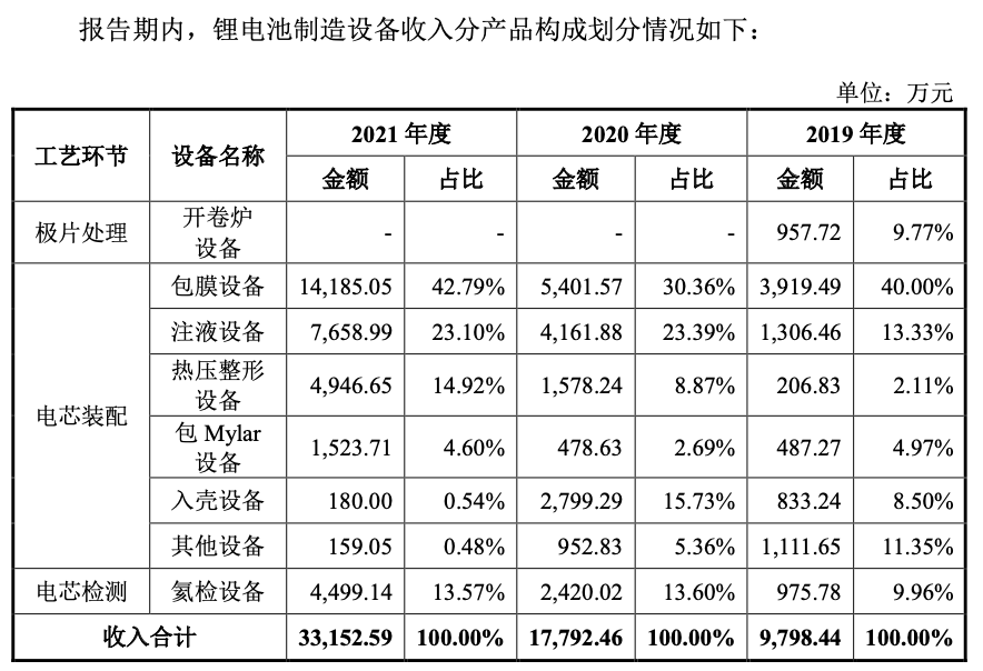 锂电池制造设备按照不同工艺分为极片处理、电芯装配和电芯检测。对应到誉辰智能细分产品,包膜设备、注液设备成为公司收入来源的顶梁柱。