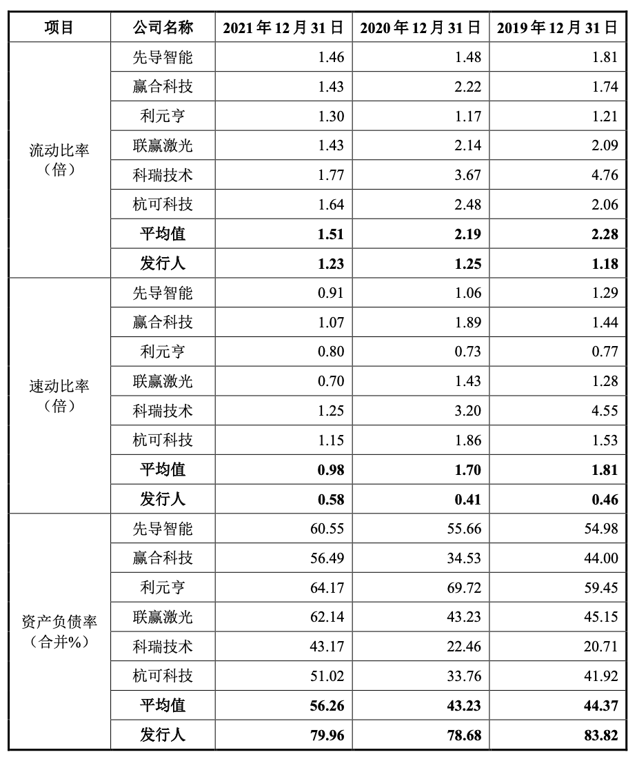 锂电设备是个资金、技术密集型产业。目前,誉晨智能的负债水平较高。报告期内,公司资产负债率(母公司)分别为83.82%、78.65%和79.95%,高于行业平均水平,而流动比率和速动比率均低于行业平均水平。