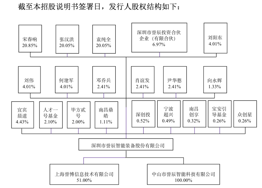 IPO前,张汉洪、宋春响和袁纯全签订一致行动协议,三人直接及间接合计持有公司63.72%的股份,并合计控制公司67.92%的股份,为誉辰智能的共同控股股东、实际控制人。