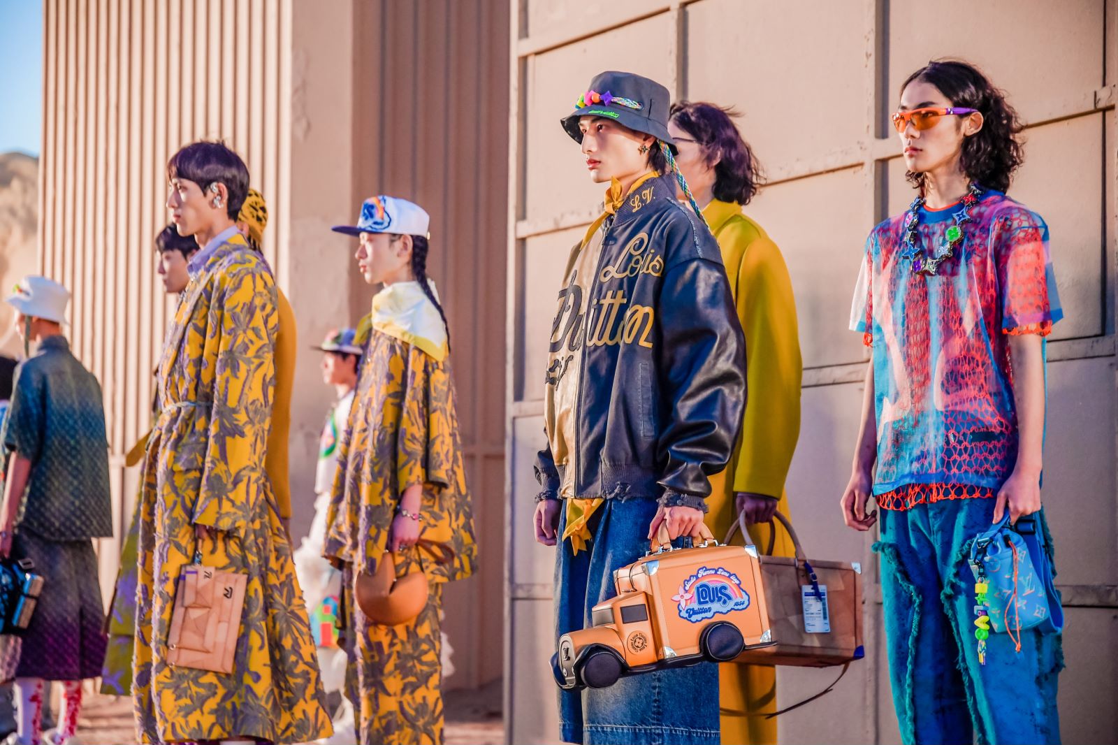 2023春夏男装系列在路易威登男装创意总监Virgil Abloh离世后发布,由曾和他共同工作过的创作团队完成。宽松的传教士长袍大衣、印满路易威登文织字母的吊带裤等装束用饱和的色彩装饰,是典型Virgil Abloh风格的体现。