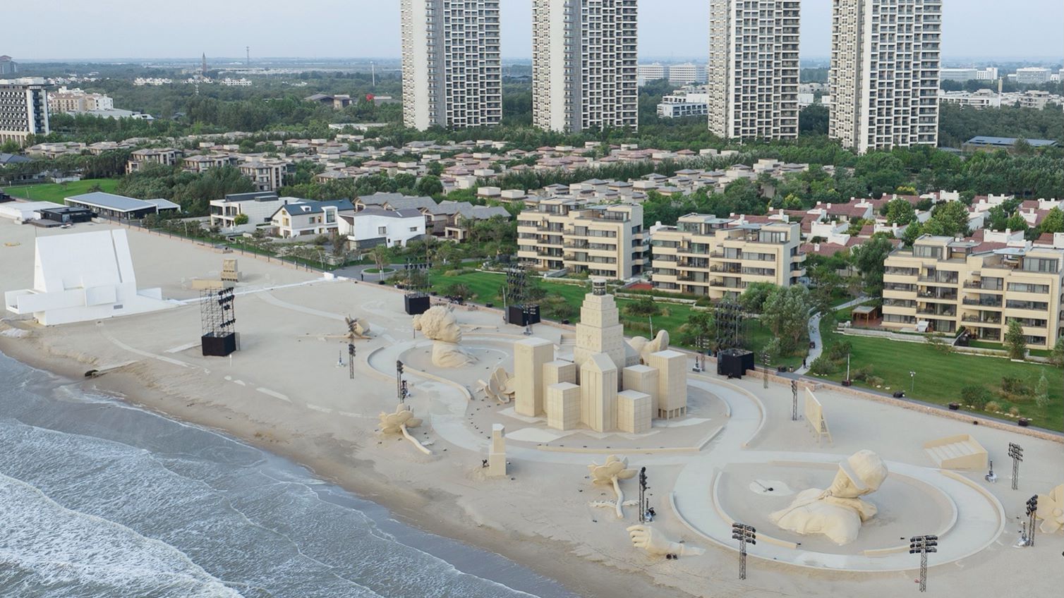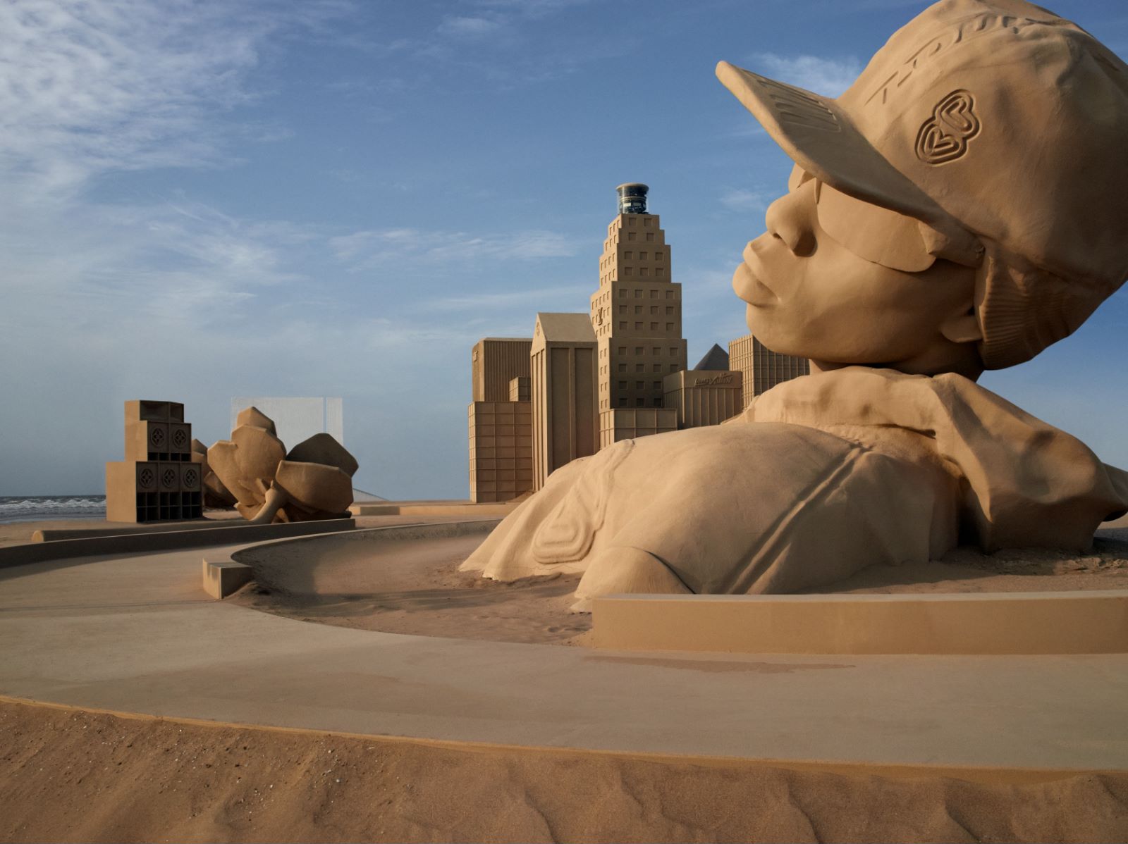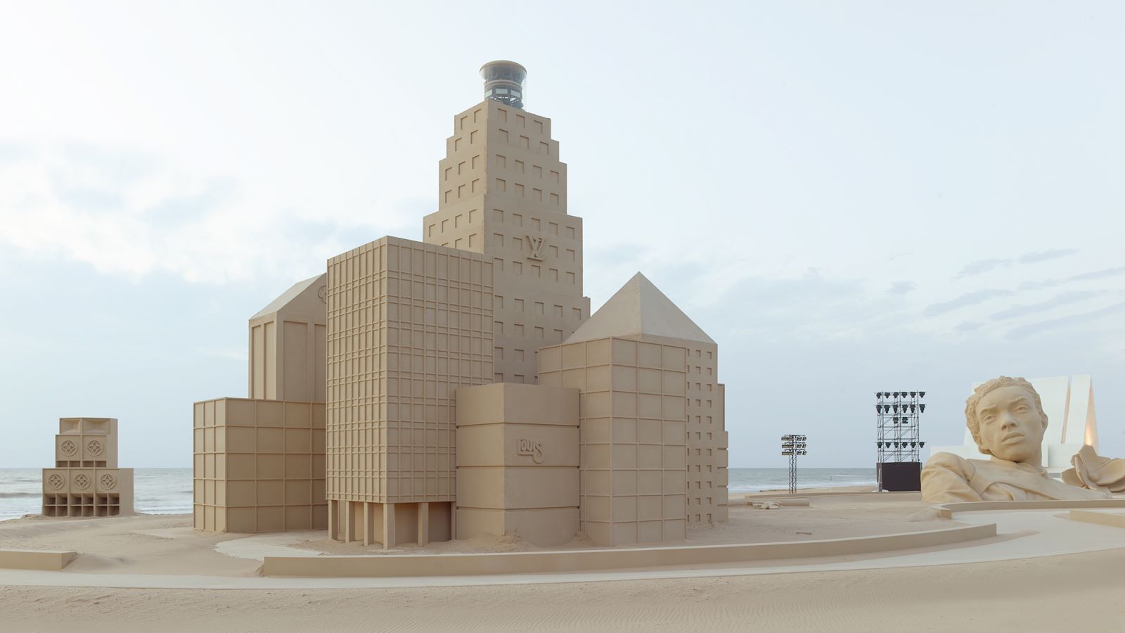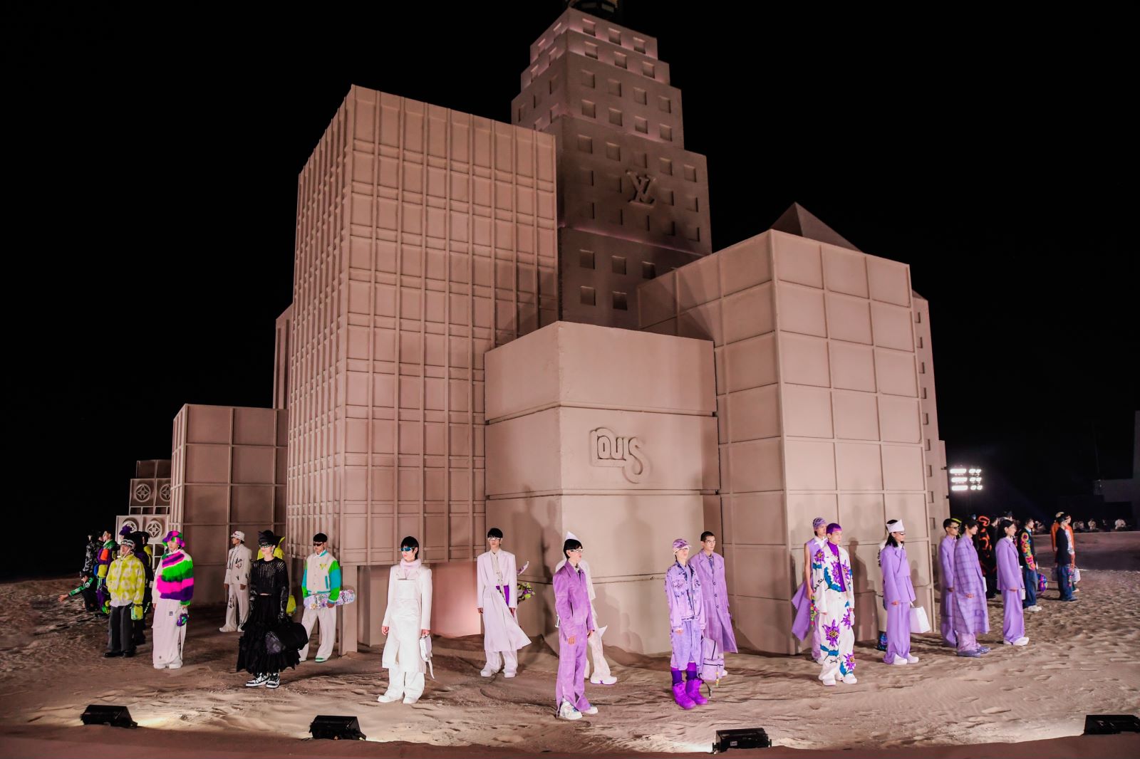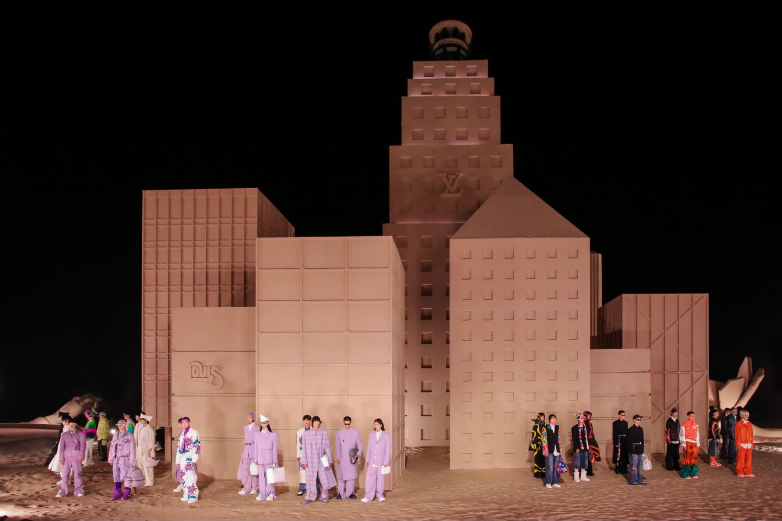 在微博和小红书等社交媒体上,网友早早已经将秀场搭建的过程分享给大众,其中包括几座高耸的人像、似乎是取材于纽约的摩天大楼群,这些是过去曾出现在Virgil Abloh的创意中。浅卡其色让它们看起来像沙雕艺术,但其实是由实打实的工业材料制成。这样的布置在古迹或都市内环艺术馆中难以实现。