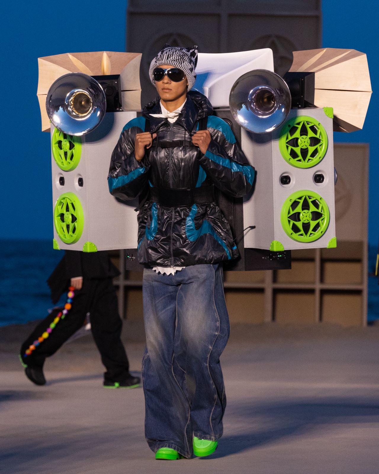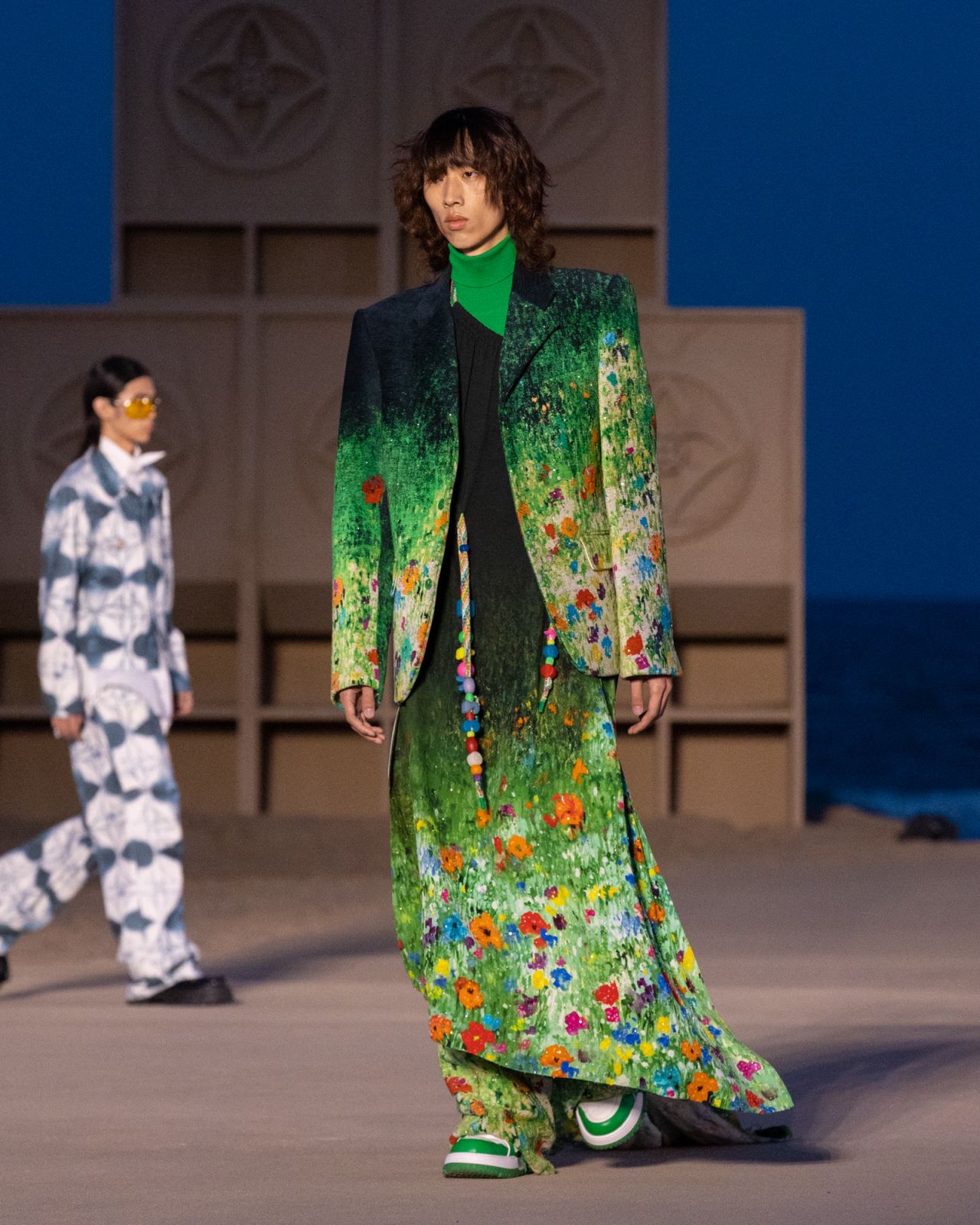 时装秀在短片结束后正式开始。路易威登在原本起伏的沙滩上铺设了平坦步道,但走秀的路程蜿蜒曲折,围绕着几尊巨大的雕塑展开。秋季北方海滩的傍晚稍凉但不冷,傍晚黄昏余晖剩余的热气正好可以衬托轻薄的春夏系列。