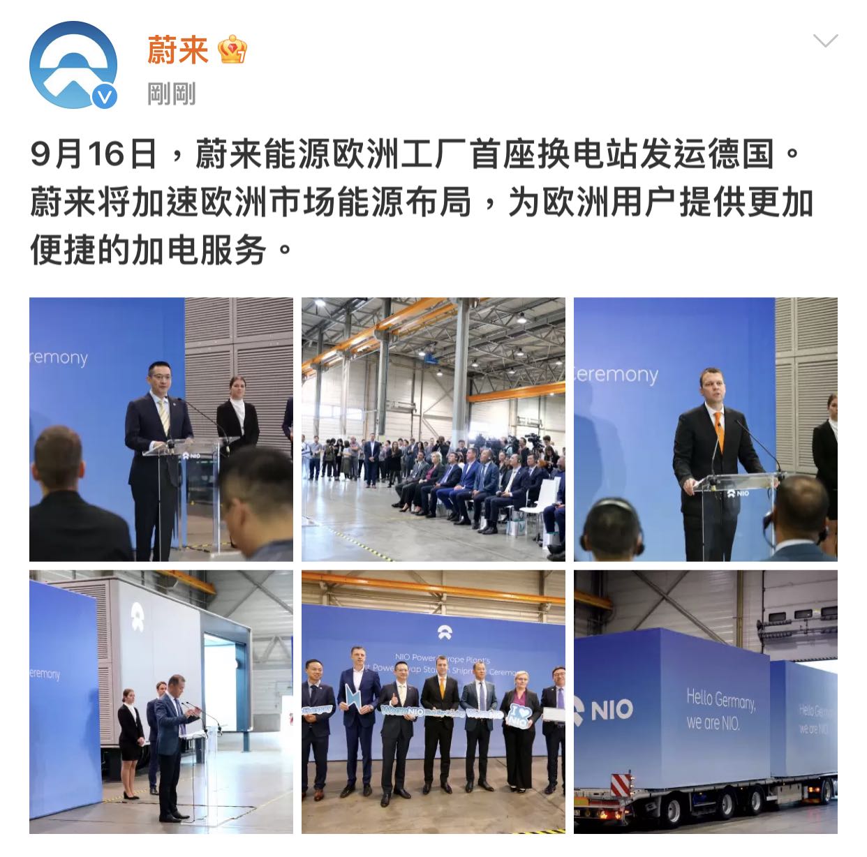 蔚来官博9月16日消息,9月16日,蔚来能源欧洲工厂首座换电站发运德国。蔚来将加速欧洲市场能源布局,为欧洲用户提供更加便捷的加电服务。