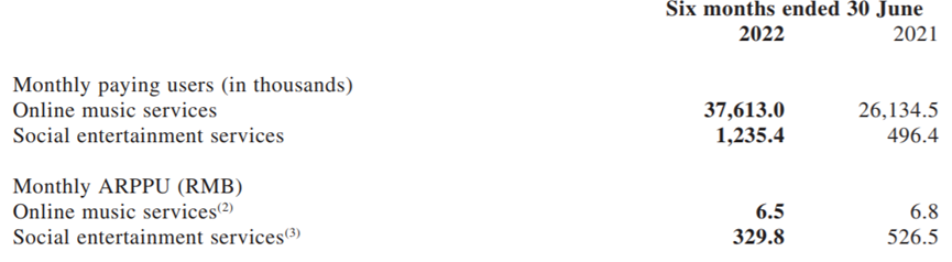 根据2022年中期财报显示,截至6月30日,网易云音乐社交娱乐服务月付费用户数为123.5万,同比增幅达149%。社交娱乐服务模块每月每付费用户收入从526.5元跌至329.8元。