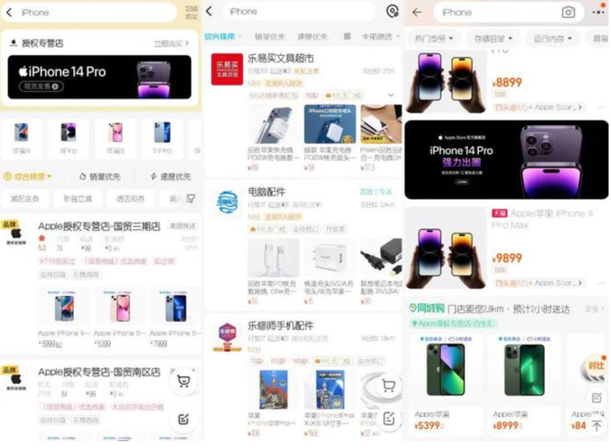 图/在美团外卖、饿了么、淘宝搜索“iPhone”的结果