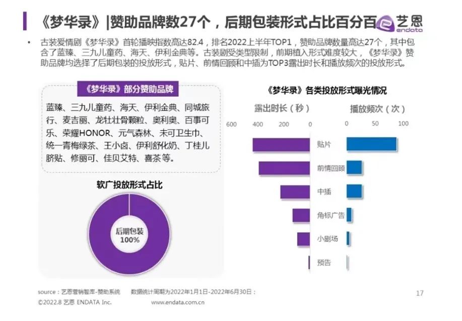 以上广告植入基本都是以台词、道具、场景等现场感十足的剧情植入为主。近些年,品牌植入的方式也在不断地向剧情外拓展:前情回顾、创意中插、创可贴、片尾鸣谢……这些方式也成为今年很多品牌投放的主要方式。据艺恩数据显示,受到的关注程度颇高的《梦华录》在品牌植入方面贴片、前情回顾、中插等形式出现较多。