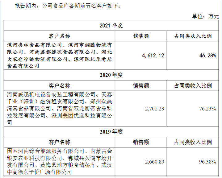 翻看老玩家凯雪冷链的近期招股书,很明显可以看到,其2019-2021年食品库业务中,大客户每年都没有重复,都只是闪现了一下。