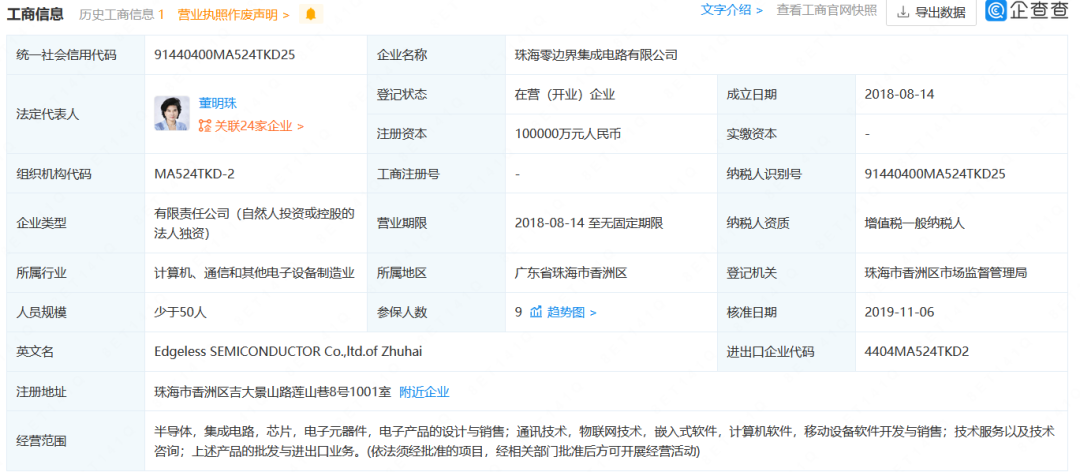(珠海零边界集成电路有限公司工商信息 图源:企查查)