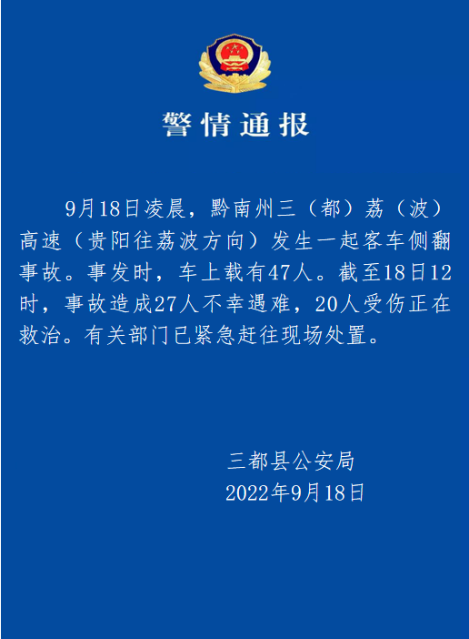 “三都公安”微信公众号9月18日通报,今日凌晨,黔南州三荔高速(贵阳往荔波方向)发生一起客车侧翻事故。事发时,车上载有47人。截至12时,事故造成27人不幸遇难,20人受伤正在救治。有关部门已紧急赶往现场处置。