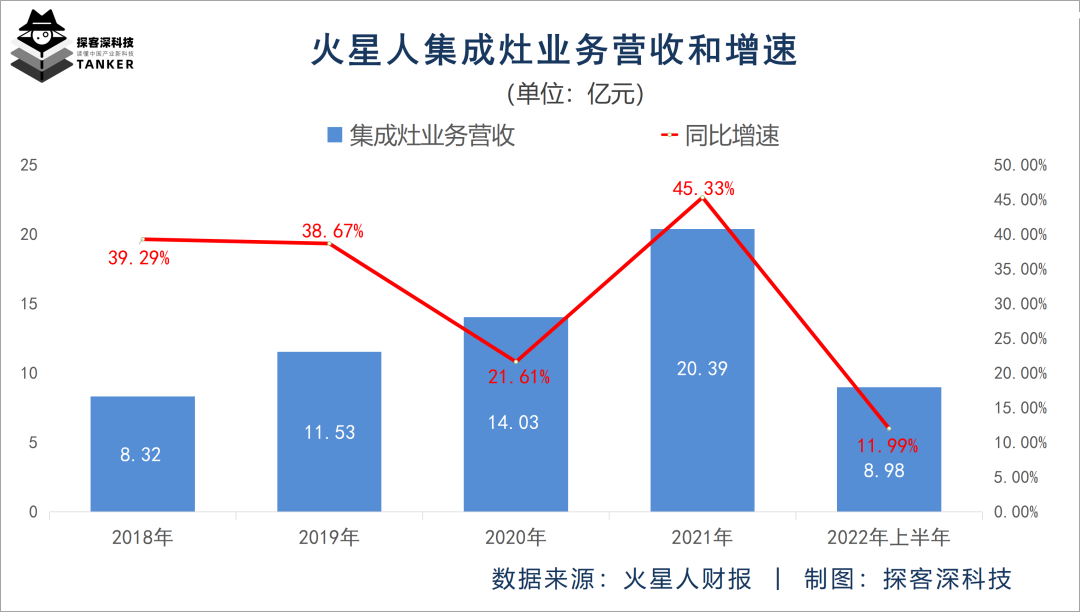 在此前的4个年度里,火星人的集成灶业务营收增速均为正值,分别为39.29%、38.67%、21.61%和45.33%,平均增速达36.23%。