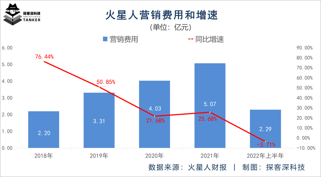 而此前4个年度火星人的营销费用增速均为正值,分别为76.44%、50.85%、21.68%和25.68%,平均增速达43.66%。