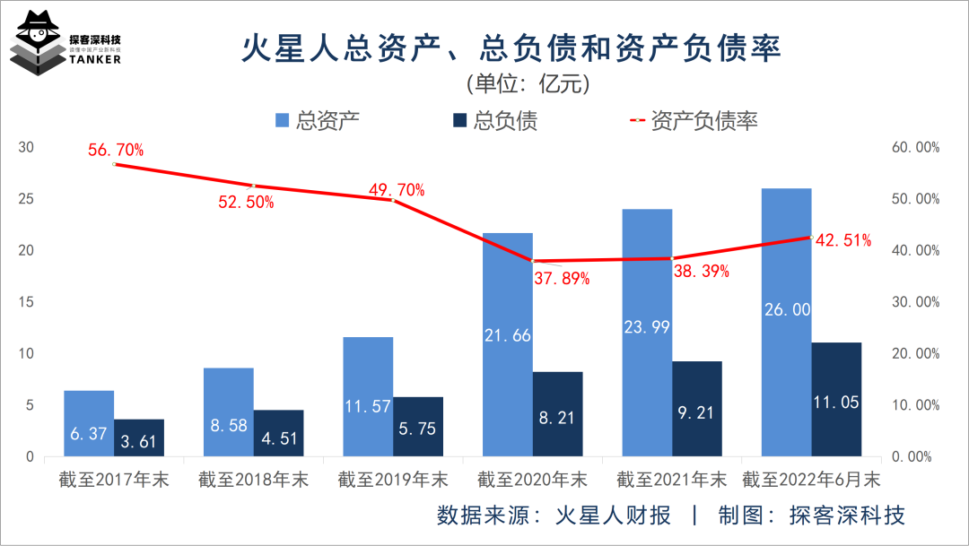 除了营收上涨之外,火星人的偿债能力指标也位于较为健康的水平。火星人披露的财报信息显示,截至2022年6月末,该公司的资产负债率为42.51%。