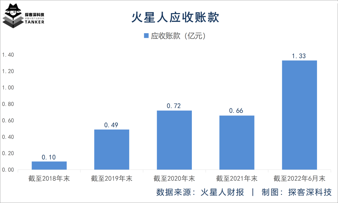 首先,火星人正面临应收账款激增的风险。根据火星人往期财报,截至2018年末,该公司的应收账款仅为0.1亿元,而截至2022年6月末,这一数值已飙升至1.33亿元。也就说,短短三年半时间,火星人的应收账款已暴增超12倍,达到1230%。