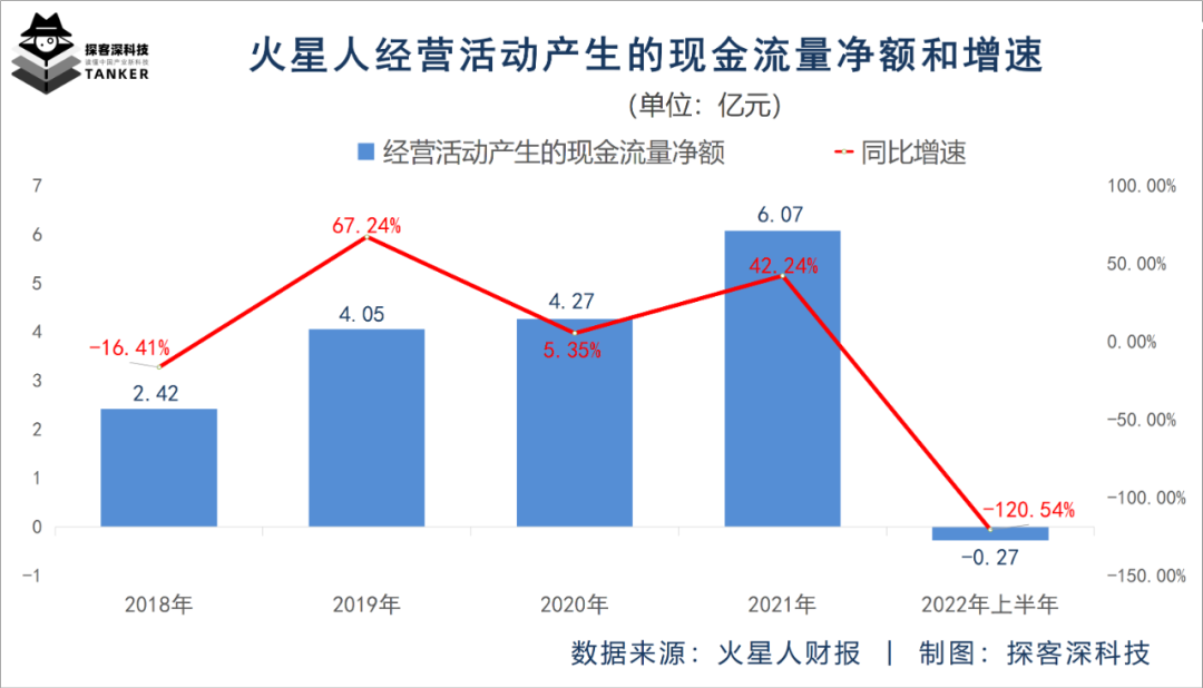 不仅如此,火星人还深陷现金流吃紧的困境。火星人披露的财报信息显示,2022年上半年该公司经营活动产生的现金流量净额为-0.27亿元,较上年同期的1.32亿元大幅下降120.54%。