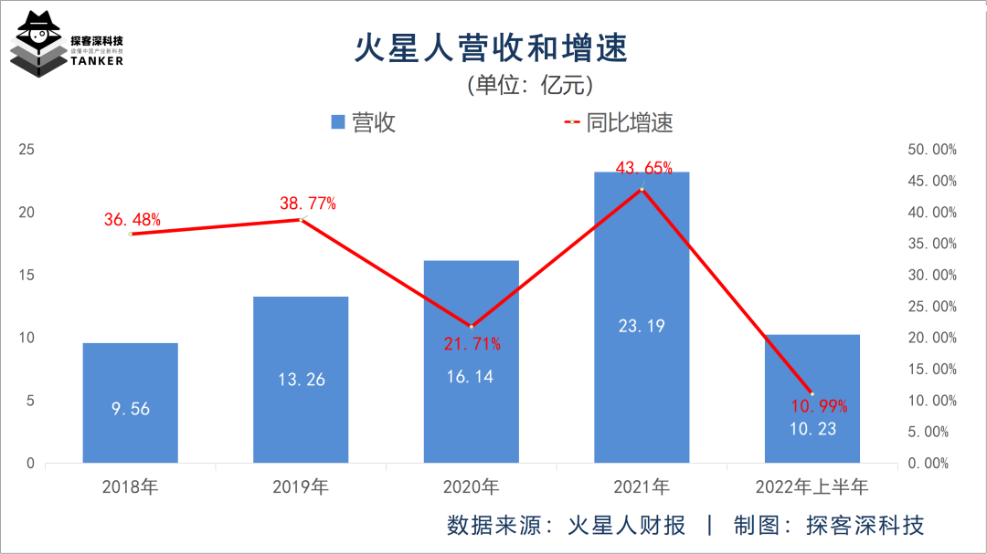 即便到了今年,火星人的营收依然在增长。最新半年报显示,2022年上半年该公司营收为10.23亿元,同增10.99%。