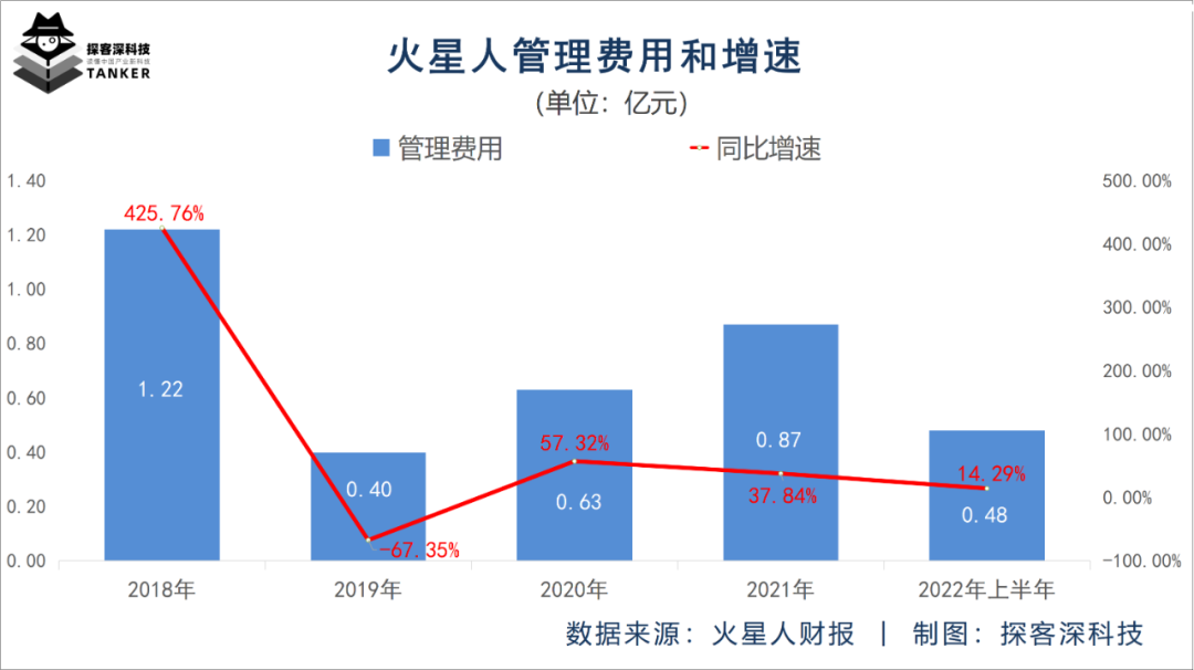 而且,在此前的4个年度里,除了2019年火星人的管理费用增速为负,其他年度该公司的这一数值均为正值,分别为425.76%、57.32%和37.84%,平均增速达173.64%。