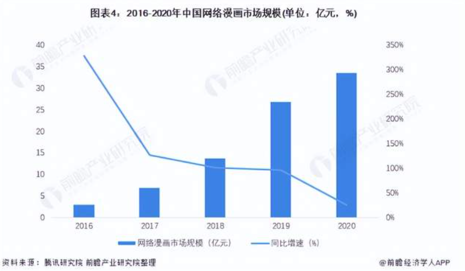 国内网络漫画市场规模同期虽属于增长状态,体量扩大了近十倍,但增速同样也在下滑。2020年,中国网络漫画市场规模达到33.5亿元,同比增速仅25%。