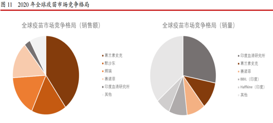 从疫苗产品销售额看,全球疫苗市场呈寡头垄断特点,葛兰素史克(GSK)、赛诺菲、默沙东和辉瑞四家公司的疫苗产品占据 80%以上的市场份额。从疫苗产品销量看,印度血清研究所为全球最大的疫苗供应商,其以低价疫苗作为主要产品,主要面向中低收入国家和地区。