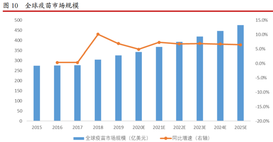 据 Evaluate Pharma 数据显示,2015-2019年间,全球疫苗市场维持增长态势,2019年市场规模约为326亿美元,同比增长6.9%。预计到2025年全球疫苗市场规模将达到 476亿美元,2020-2025年间复合增速预计为6.8%。
