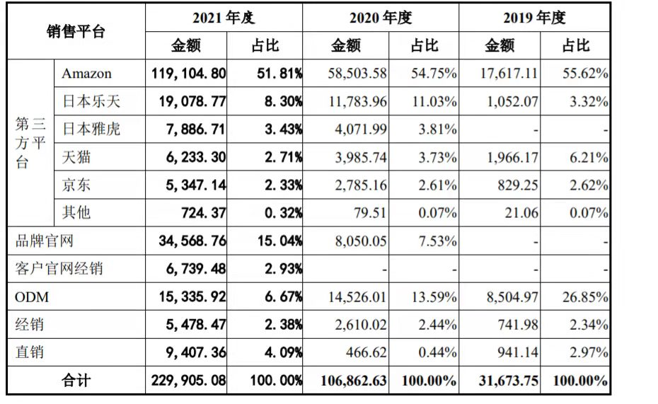 渠道上,华宝新能则主要通过亚马逊、日本乐天、日本雅虎等第三方平台销售产品。2019年至2021年,公司通过这些第三方电商平台获得的线上销售额占总营收比重分别为67.83%、75.99%和68.89%。其中,仅来自亚马逊的线上销售额占总营收的比例就达到了51.81%,占据半壁江山。