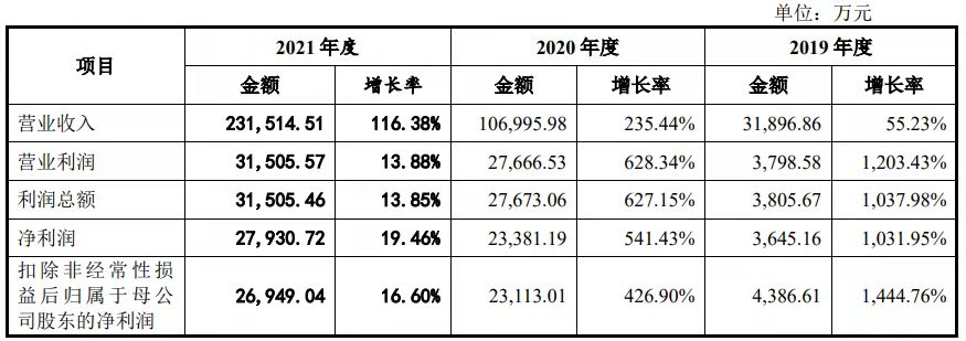 招股书显示,过去三年,公司的营业收入分别为3.19亿元、10.7亿元和23.15亿元,同比增速分别为55.23%、235.44%和11.38%,年均复合增速达到124.18%;净利润方面,则达到0.36亿元、2.34亿元和2.79亿元,年均复合增速达到296.06%。