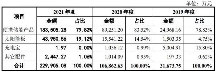 具体业务来看,华宝新能目前的主营业务可分为四大项:便携储能产品、太阳能板、充电宝与其他配件。其中,华宝能源近三年的飞速增长,离不开便携式储能产品的放量带动。