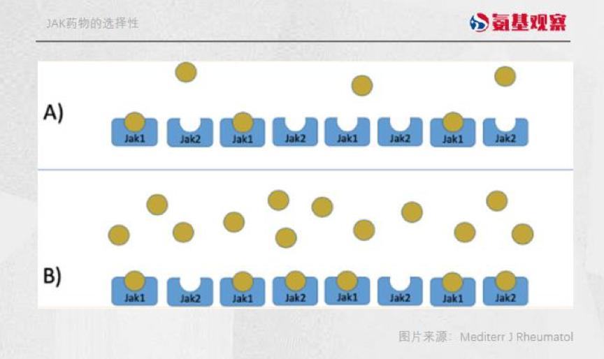 然而,随着细胞内药物浓度的增加,一个JAK抑制剂也可能会影响ATP与其他JAK激酶的结合,失去选择性。