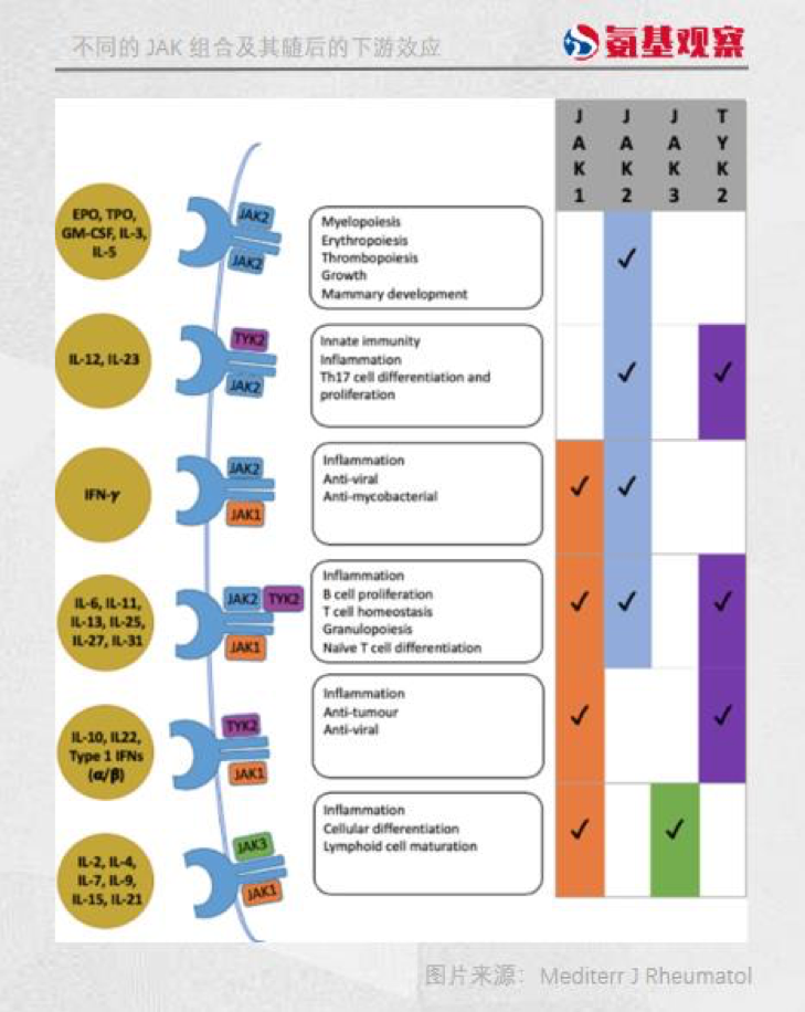 而JAK家族的每个成员都发挥着多种作用,所以当JAK药物对其他JAK家族成员出现抑制的时候,会产生多种副作用。